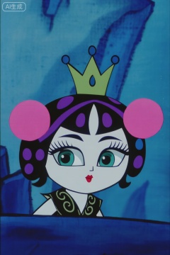 这是国产经典动画《葫芦兄弟》的场景,画面中是蛇精的妹妹—— 蝴蝶精。她以剪纸手法呈现,轮廓清晰、线条硬朗。头戴绿色王冠,头发紫黑相间并点缀蓝色圆点,粉色圆球状发髻可爱俏皮,碧绿大眼,眼睫毛纤长,身着带有黑色花纹的服饰。背景运用水墨画手法晕染,以蓝色为主调,营造出神秘的氛围,尽显动画独特的艺术风格。