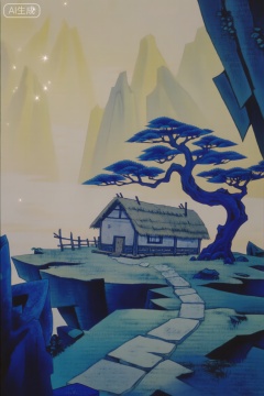 这是国产经典动画《葫芦兄弟》中的场景,画面里,悬崖边缘坐落着一间茅草屋,屋顶铺着茅草,屋旁竖着木栅栏,一条石板小径蜿蜒而出。一棵造型苍劲的蓝色松树生长于此,枝丫舒展。远处群山在淡黄色的雾气笼罩下,若隐若现,左上角还有闪耀的光点,整个场景充满神秘的东方韵味,以剪纸动画的独特风格,展现出宁静又奇幻的氛围。