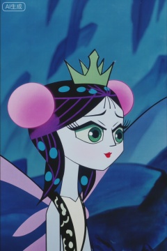 这是国产经典动画《葫芦兄弟》的场景,画面中是蛇精的妹妹—— 蝴蝶精。她以剪纸手法呈现,轮廓清晰、线条硬朗。头戴绿色王冠,头发紫黑相间并点缀蓝色圆点,粉色圆球状发髻可爱俏皮,碧绿大眼,眼睫毛纤长,身着带有黑色花纹的服饰。背景运用水墨画手法晕染,以蓝色为主调,营造出神秘的氛围,尽显动画独特的艺术风格。