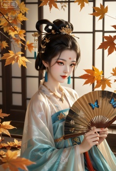 score_9,score_8_up,score_7_up,source_anime,1girl,solo,black hair,hair ornament,long sleeves,holding,jewelry,earrings,necklace,hair bun,mole,looking to the side,leaf,facial mark,chinese clothes,single hair bun,bug,butterfly,hand fan,forehead mark,folding fan,hair stick,holding fan,maple leaf,hanfu,,eyelashes,makeup,lipstick,tassel,pale skin,light eyeshadow,makeup,translucent,realistic,high detailed  skin,(detailed skin:1.1),highly detailed,ultra-high resolution,32K UHD,sharp focus,best-quality,masterpiece,golden hour,unconventional supreme masterpiece,masterful details,temperate atmosphere,with a high-end texture,in the style of fashion photography,Dynamic Angle,(Dynamic posture:1.1),