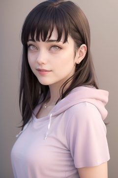 masterpiece, (photorealistic:1.4), best quality, beautiful lighting, HinataNS, solo, looking_at_viewer, smile, hood, simple_background, upper_body, collarbone, hoodie, shirt, border, pink_shirt, purple_background, from_side, RAW photo, 8k uhd, film grain <lora:HinataNS:1>