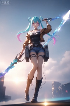 1girl, solo, long hair, looking at viewer, bangs, hair ornament, jewelry, purple eyes, braid, twintails,multicolored hair, choker, hairclip, pink eyes, off shoulder, star \(symbol\), nail polish, bracelet, aqua hair, ring, hair rings, star hair ornament, off-shoulder shirt,open mouth, simple background, white background, holding, green eyes, jacket, full body, weapon, male focus, boots, belt, sword, thigh strap, dual wielding, paradis military uniform, wire, three-dimensional maneuver gear , depth of field, light particles, lens flare ,backlighting,depth of field,cinematic lighting,light particles,lens flare, extreme aesthetic,(wlop:0.8),masterpiece,best quality,good quality,newest,very aesthetic,absurdres,A shot with tension, 32K UHD,sharp focus,best-quality,masterpiece,Emotionalization,temperate atmosphere,with a high-end texture,in the style of fashion photography, (Visual impact:1.2),impactful picture,offcial art,colorful,movie perspective, masterpiece