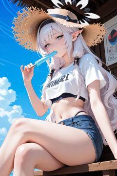 1girl,absurdres,alternate_costume,bikini,black_bikini,black_hairband,blue_archive,crop_top,crossed_legs,denim,denim_shorts,earclip,food,hair_tubes,hairband,halo,hat,highres,himari_\(blue_archive\),long_hair,looking_at_viewer,mola_\(mola526\),mole,mole_under_eye,multicolored_halo,pointy_ears,popsicle,shirt,shorts,sitting,solo,straw_hat,swimsuit,two-tone_halo,white_hair,white_halo,white_shirt