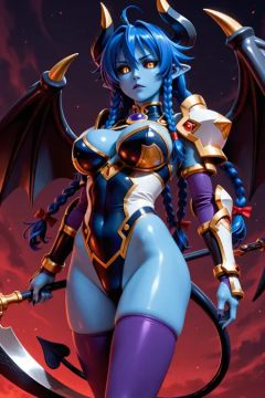 1girl,arm_armor,black_wings,blue_hair,blue_skin,braid,breasts,clothing_cutout,colored_sclera,colored_skin,demon_girl,demon_horns,demon_tail,demon_wings,highleg,highleg_leotard,highres,horns,large_breasts,leotard,long_hair,low_twin_braids,purple_thighhighs,ravina_\(shinrabanshou\),scythe,shinrabanshou,sibelube,solo,tail,thighhighs,twin_braids,wings,yellow_eyes
