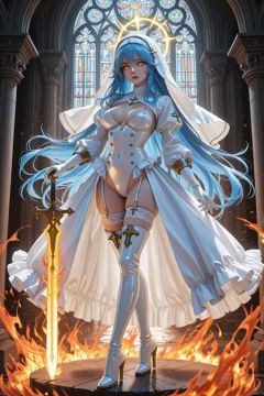 1girl,absurdres,blue_hair,boots,breasts,dress,fire,frilled_dress,frills,full_body,garter_straps,gloves,high_heel_boots,high_heels,highres,leotard,long_hair,looking_at_viewer,magic,medium_breasts,mytea_\(soso\),nun,showgirl_skirt,shrug_\(clothing\),solo,standing,sword,thigh_boots,thighhighs,veil,very_long_hair,weapon,white_gloves,white_leotard,white_shrug,white_thighhighs,yellow_eyes
