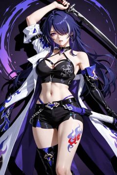 1girl,absurdres,acheron_\(honkai:_star_rail\),arm_up,belt,black_belt,black_choker,black_gloves,black_shirt,black_shorts,boots,breasts,choker,coat,coattails,collarbone,criss-cross_halter,crop_top,drawing_sword,drop_shadow,earrings,elbow_gloves,eyes_visible_through_hair,full_body,gloves,hair_over_one_eye,halterneck,highres,honkai:_star_rail,honkai_\(series\),jewelry,knee_boots,large_breasts,leg_tattoo,long_hair,looking_at_viewer,midriff,multicolored_hair,navel,ootachi,parted_lips,purple_eyes,purple_hair,scabbard,setsu_\(qjsj1993aa\),sheath,shirt,shorts,single_elbow_glove,single_knee_boot,single_thigh_boot,single_wide_sleeve,solo,streaked_hair,sword,tattoo,thigh_boots,unsheathing,weapon,white_coat