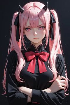 blush,red_bowtie,small_horns,solo,long_hair,bow,horns,black_ribbon,pink_hair,red_bow,pink_eyes,ribbon,highres,bowtie,twintails,frown,black_shirt,upper_body,black_horns,hair_ribbon,long_sleeves,mandarin_collar,looking_at_viewer,sho_\(sho_oe4\),crossed_arms,1girl,shirt,v-shaped_eyebrows,closed_mouth