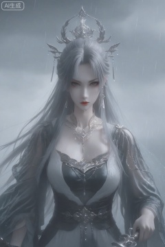 1girl, weapon, sword, rain, long hair, hair ornament, holding, solo, dress, hair bun, holding weapon, holding sword, upper body, jewelry, grey hair, looking at viewer