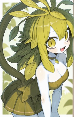 artist:ketopon, 1girl, blurry, blurry background, breasts, choker, cleavage, colored skin, cowboy shot, fangs, film grain, green background, green hair, green shirt, green skirt, grey choker, hair between eyes, hair ornament, leaf hair ornament, leaning forward, long hair, medium breasts, monster girl, open mouth, plant girl, plant hair, plant tail, pleated skirt, shirt, sidelocks, skin fangs, skirt, slit pupils, smile, strapless, strapless shirt, white skin, yellow eyes,masterpiece,best quality,good quality,newest,year 2024,year 2023,very aesthetic,absurdres,Visual impact,A shot with tension,ultra-high resolution,32K UHD,sharp focus,best-quality,masterpiece,<lora:ketopon_v0.1_Illustrious-000034:1>,