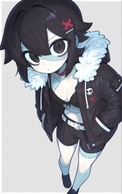 artist:ketopon, 1girl, :<, belt, black bra, black eyes, black hair, black jacket, black shoes, black shorts, bra, choker, closed mouth, drawstring, film grain, flipped hair, frown, fur-trimmed jacket, fur trim, grey background, hair between eyes, hair ornament, hairclip, hands in pockets, jacket, long sleeves, looking at viewer, monster girl, open clothes, open jacket, patchwork skin, red choker, scar, scar on leg, shoes, short hair, shorts, slit pupils, underwear, v-shaped eyebrows, white belt, zombie,masterpiece,best quality,good quality,newest,year 2024,year 2023,very aesthetic,absurdres,Visual impact,A shot with tension,ultra-high resolution,32K UHD,sharp focus,best-quality,masterpiece,<lora:ketopon_v0.1_Illustrious-000034:1>,