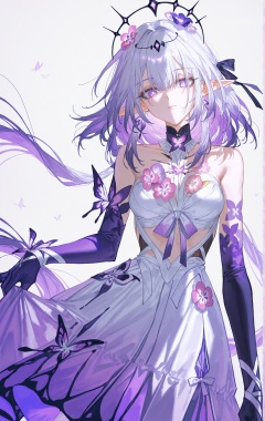 (artist:quasarcake:0.8),extreme aesthetic,(wlop:0.6),(honjou raita,lack,rella,wanke:0.5),masterpiece,best quality,good quality,newest,year 2024,year 2023,very aesthetic,absurdres,Visual impact,A shot with tension,ultra-high resolution,32K UHD,sharp focus,best-quality,masterpiece,Emotionalization,unconventional supreme masterpiece,masterful details,temperate atmosphere,with a high-end texture,in the style of castorice \(honkai: star rail\),bright pupils,butterfly,bare shoulders,breasts,1girl,bug,closed mouth,dress,elbow gloves,flower,gloves,hair flower,hair ornament,long hair,looking at viewer,pointy ears,purple butterfly,purple eyes,purple flower,purple gloves,purple hair,artist:rekka shinai,simple background,solo,very long hair,white background,white dress,white pupils,<lora:castorice_v0.2_Illustrious-000015>,