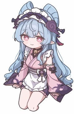 yumemizuki_mizuki,artist:banbon,1girl,bell,blue_hair,apron,choker,closed_mouth,detached_sleeves,frilled_hairband,frills,from_above,hairband,japanese_clothes,long_hair,long_sleeves,looking_at_viewer,neck_bell,******ami,pink_eyes,pointy_ears,cropped_legs,bright_pupils,smile,solo,simple_background,very_long_hair,sitting,white_background,yumemizuki_mizuki,white_apron,white_pupils,