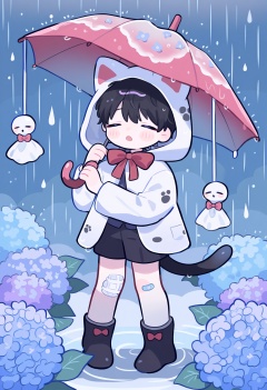 1boy,male focus,closed eyes,umbrella,black hair,holding,shorts,flower,bandaid on leg,tail,cat tail,hydrangea,red bow,bow,bandaid,solo,holding umbrella,raincoat,hood up,hood,black shorts,red bowtie,bowtie,black footwear,rain,cat boy,full body,animal ears,long sleeves,bandaid on knee,short hair,cat ears,boots,animal hood,open mouth,facing viewer,teruterubouzu,child,blush,<lora:Lovely_Illustrious_v0.1-000020:0.6>,