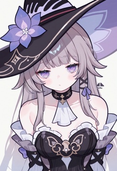the_herta_\(honkai:_star_rail\),(masterpiece:1.2),best quality,good quality,newest,year 2024,year 2023,very aesthetic,absurdres,1girl,black_dress,bare_shoulders,black_hat,choker,detached_sleeves,dress,grey_hair,hat,herta_\(honkai:_star_rail\),long_hair,looking_at_viewer,official_alternate_costume,ascot,solo,black_choker,artist:selvha,the_herta_\(honkai:_star_rail\),upper_body,very_long_hair,strapless,witch_hat,strapless_dress,white_ascot,