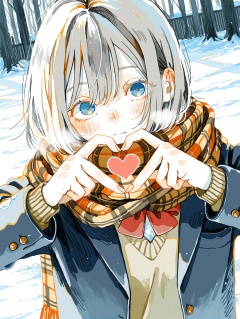 1girl,   grey hair,  short hair,   hair between eyes,   tiny breasts, pale skin,   BREAK 1girl,  heart hands, kuji-in, Head on chest,           BREAK    winter uniform, school uniform, blazer, plaid scarf,  Snow, Winter, Icy Mountais, ravine, (winter clothes, thick clothes),        BREAK (watanabe tomari:1.05), (fjsmu:0.7), (watari \(nijimukiokuiro\):0.85), ,masterpiece,best quality,