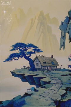 国产经典动画《葫芦兄弟》中的场景,画面里,悬崖边缘坐落着一间茅草屋,屋顶铺着茅草,屋旁竖着木栅栏,一条石板小径蜿蜒而出。一棵造型苍劲的蓝色松树生长于此,枝丫舒展。远处群山在淡黄色的雾气笼罩下,若隐若现,左上角还有闪耀的光点,整个场景充满神秘的东方韵味,以剪纸动画的独特风格,展现出宁静又奇幻的氛围。