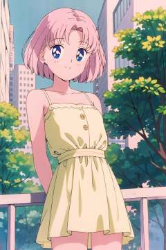 best quality, masterpiece,  <lora:smv1-10:1>, 1girl, light smile, looking at viewer, pink hair, short hair, city, sundress,cowboy shot, arms behind back,
