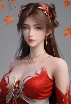 (score_9),<lora:火灵儿天神-apony-000009:0.83>,huolinger,1girl,solo,long hair,brown hair,brown eyes,jewelry,hair ornament,necklace,red dress,earrings,detached sleeves,clothing cutout,gold accents,front view,looking at viewer,light blush,(stretch:1.1),hand_gesture,(middle_finger:1.2),BREAK<lora:Expressive_H-000001:0.8>,collarbone,(glamor:1.2),(mature_female),large breasts,pointy breasts,puffy breasts,<lora:e肤色滑块:0.35>,fair_skin,(white_skin),(Ivory_skin),BREAK<lora:SDS-XL泛光调节器_v1.0:1.2>,simple background,grey background,in autumn,grove,(maple_tree),(maple_leaf),leaf,autumn leaves,falling leaves,branch,twig,