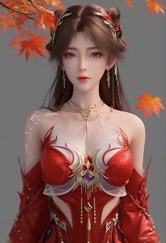 (score_9),<lora:火灵儿天神-apony-000009:0.83>,huolinger,1girl,solo,long hair,brown hair,brown eyes,jewelry,hair ornament,necklace,red dress,earrings,detached sleeves,clothing cutout,gold accents,front view,looking at viewer,BREAK<lora:Expressive_H-000001:0.8>,collarbone,(glamor:1.2),(mature_female),large breasts,pointy breasts,puffy breasts,<lora:e肤色滑块:0.5>,fair_skin,(white_skin),(Ivory_skin),BREAK<lora:SDS-XL泛光调节器_v1.0:1.2>,simple background,grey background,in autumn,grove,(maple_tree),(maple_leaf),leaf,autumn leaves,falling leaves,branch,twig,<lora:皮肤凹痕:1>,