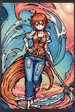 artbytokiame, masterpiece, best quality, 1girl, namiemb, orange hair, closed mouth, earrings, detailed background, jewelry, looking at viewer, shirt, short hair, long_jeans, solo, nami from one piece, ink painting, full body