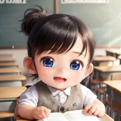 masterpiece, best quality,Big head doll,big head, small body, Mini Body,top-heavy,cute,Doll Body,Short hands, short feet,Short legs,1boy sit in classroom, smile,<lora:bigHeadDoll_v01:0.66>