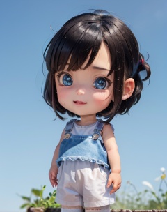 Big head doll,big head, small body, Mini Body,top-heavy, cute,Doll Body,Short hands, short feet,Short legs, 1girl, white shirt, track_pants,( black shor hair,bob cut), smile,    looking at viewer   <lora:bigHeadDoll_v01:1>