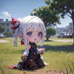 Big head doll,big head, small body, Mini Body,top-heavy,cute,Doll Body,Short hands, short feet,Short legs,(masterpiece:1.331), best quality,stitches,Big head doll, big head, small body, cute,Doll Body,Empty-handed,No items in hand,No object in front of you,1girl, 3d, ahoge, blue_dress, blue_hair, blur_censor, blurry, blurry_background, blurry_foreground, blush, bokeh, braid, chibi, christmas_tree, chromatic_aberration, dandelion, day, depth_of_field, dress, field, film_grain, flower, flower_field, focused, frilled_dress, garden, grass, hair_bow, motion_blur, on_grass, on_ground, outdoors, path, photo_\(medium\), photo_background, plant, rainbow, red_bow, red_ribbon, ribbon, tree, white_hair, yellow_flower