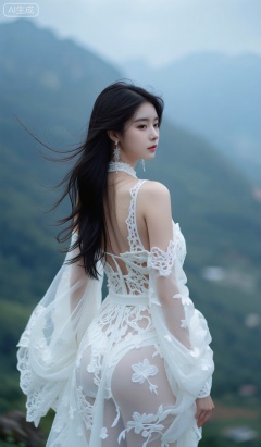 一位美丽的年轻亚洲女人的照片,有着长长的黑发,穿着白色,错综复杂的蕾丝式连衣裙,带有花卉图案。她站在雾蒙蒙的山区背景上,背部微微转过身,宁静地看着她的肩膀。这件衣服具有纯粹,飘逸的品质。她戴着精致的垂悬的耳环。照明柔软自然,增强了空灵而梦幻的氛围。该图像具有浪漫,幻想的美学,重点是优雅和优雅。