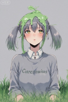 {{{nahida (genshin impact)}}},twintails,on_head,slime,slimel_on_head,green slime,solo,looking_at_viewer,long_hair,grass,leaf,slime_on_head,head_rest,animal,simple_background,grey_background,:t,long_sleeves,hair_between_eyes,upper_body,grey_shirt,shirt,pout,bangs,closed_mouth,sweater,english_text,best quality,amazing quality,very aesthetic,absurdres,masterpiece,extreme aesthetic,(quasarcake:0.7),masterpiece,best quality,good quality,newest,year 2024,year 2023,very aesthetic,absurdres,