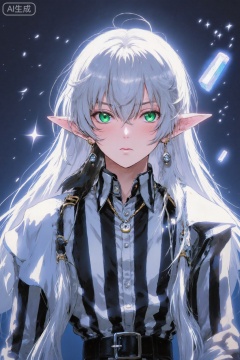 solo, long hair, looking at viewer, bangs, shirt, long sleeves, 1boy, twintails, jewelry, closed mouth, green eyes, white hair, male focus, earrings, pointy ears, striped, belt, parted bangs, sparkle, capelet, floating hair, elf, androgynous, black belt, glint, white capelet, floating object