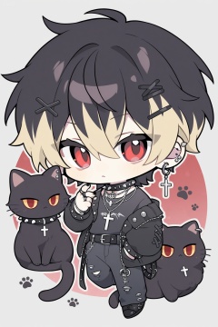 solo,, short hair,, blonde hair,, black hair,, hair ornament,, red eyes,, 1boy,, hair between eyes,, jewelry,, male focus,, multicolored hair,, earrings,, necklace,, collar,, piercing,, cat,, ring,, cross,, x hair ornament,, ear piercing,, black nails,, spikes,, black cat,, spiked collar,, (chibi:1.2),, Negative prompt: ng_deepnegative_v1_75t,(badhandv4:1.2),EasyNegative,(worst quality:2),,nsfw, Steps: 35, Sampler: Euler a, CFG scale: 7.0, Seed: 14159469, Size: 1024x1536, Model hash: e645ee1569, Model: Anime Model-Illustrious_v1.00.safetensors, Denoising strength: 0.0, Clip skip: 2, ENSD: 31337, RNG: CPU, Lora 1: 【ELK】QQ小人, Lora Hash 1: 91e7719d06, Lora Weight 1: 0.8, vae_name: automatic