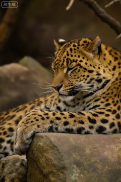masterpiece, , The image shows a leopard resting on a rock. The leopard has a distinctive coat with a pattern of dark spots on a golden-yellow background. Its eyes are closed, and it appears to be in a relaxed state, lying comfortably. The background consists of a natural setting with rocks and branches, suggesting an outdoor environment, possibly a zoo or a wildlife reserve. The lighting is soft, creating a serene atmosphere.