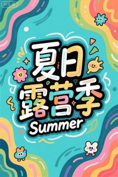 字体设计“夏日露营季”富有创意,创意手绘潮流字体,文字排版,高级艺术,英文“Summer”,标题周围点缀有卡通图案,将字体进行抽象变形,创造出独特的节奏和动感