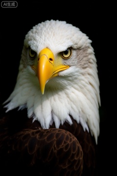 masterpiece, , The image shows a close-up of a bald eagle, a bird of prey known for its striking white head and yellow beak. The eagle's eye is prominent, with a sharp, focused gaze. The feathers around the neck are white, transitioning to dark brown on the body, which is partially visible. The background is dark, likely to highlight the eagle's features and create a dramatic contrast. The image captures the eagle's majestic and regal appearance, emphasizing its powerful presence.