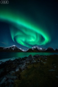 masterpiece, , The image depicts a nighttime scene with a stunning view of the Northern Lights, also known as the aurora borealis, illuminating the sky in vibrant green hues. The lights appear as curved arcs, creating a mesmerizing display above the landscape. In the foreground, there is a rocky shoreline with scattered stones and patches of grass. Beyond the shore, a body of water reflects the lights, adding to the serene and tranquil atmosphere. In the background, there are snow-capped mountains, their peaks partially obscured by the night sky. The sky is dotted with stars, enhancing the overall magical and peaceful ambiance of the scene.
