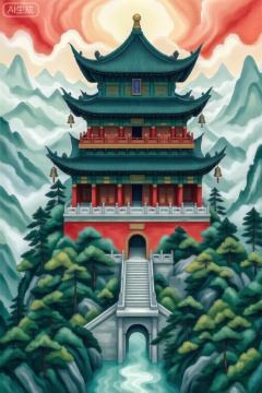 标题:古韵楼阁一座巍峨的中式古建筑,飞檐翘角,雕梁画栋,琉璃瓦顶在下熠熠生辉;整体为传统宫殿或楼阁风格,依山傍水,云雾缭绕,松柏掩体;红墙金饰,木构精巧,檐下悬挂铜铃与宫灯;前景有石阶、牌坊或小桥流水,远处群山淡影,天空霞光突变;画面风格为细腻插画,色彩优雅,光影柔和,带有中国水墨意境与工笔,表现细节宁静庄严的古典之美。