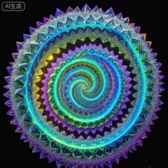 内发光,,水晶工艺,几何体,图像描绘了一个充满活力,复杂的螺旋设计,类似于曼荼罗或分形图案。螺旋由多个同心层组成,每层都充满了几何形状和复杂的细节。颜色主要是蓝色、绿色和紫色,有一些黄色的亮点。设计是对称的,从中心向外辐射,创造了一种深度和运动感。背景是黑色的,与明亮的彩色螺旋形成鲜明对比,使其突出突出。整体效果令人着迷,视觉上引人注目,唤起了一种和谐与复杂的感觉。