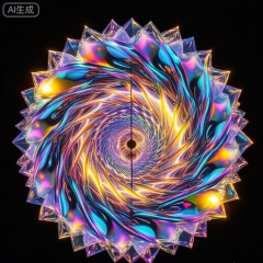 内发光,,水晶工艺,几何体,图像描绘了一个充满活力,设计是对称的,从中心向外辐射,创造了一种深度和运动感。背景是黑色的,与明亮的彩色螺旋形成鲜明对比,使其突出突出。整体效果令人着迷,视觉上引人注目,唤起了一种和谐与复杂的感觉。
