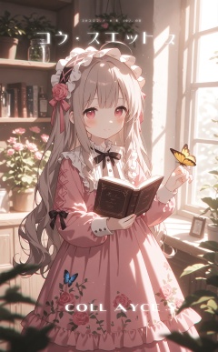 masterpiece,very aware,highres,absurdres,newest,best quality,loli,petite,high quality,chromatic_aberration,cinematic_angle,dutch angle,//,konya karasue,1girl,bug,butterfly,jar,book,pink dress,dress,frills,frilled dress,window,solo,smile,flower,holding,hairband,looking at viewer,long hair,indoors,red eyes,blush,hair ornament,open book,shelf,butterfly on hand,holding book,blue butterfly,closed mouth,long sleeves,pink flower,hair flower,frilled hairband,bow,plant,collared dress,ribbon,lolita hairband,lolita fashion,floral print,bookshelf,dress bow,puffy long sleeves,grey hair,frilled collar,blunt bangs,blurry,frilled sleeves,bowtie,standing,fruit,neck ribbon,pink ribbon,black bow,cover,food,light brown hair,wavy hair,ahoge,headdress,day,blurry foreground,puffy sleeves,brown hair,very long hair,black ribbon,collar,pink bow,dot nose,depth of field,dated,potted plant,sunlight,leaf,sweet lolita,yellow butterfly,sleeve cuffs,light blush,cover page,bottle,cowboy shot,black bowtie,animal,maid headdress,sidelocks,book stack,pink theme,pink rose,white collar,looking at animal,hair ribbon,jewelry,cabinet,petticoat,feet out of frame,medium dress,frilled shirt collar,rose print,print dress,red bow,black hairband,red ribbon,long dress,buttons,hair bow,hands up,red flower,split mouth,bookmark,hand up,hanging plant,backlighting,brown bow,eyelashes,pink eyes,blurry background,light smile,curly hair,layered dress,sleeve bow,artist,