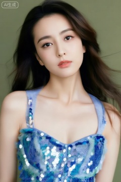 上半身真实照片,真人肌肤纹理,4K画质,美女写真艺术照,简单背景,面对镜头,下额微抬起,表情深邃,长发轻飘,蓝色亮片裙,