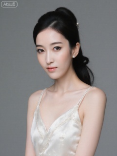 Shot by 12K Phase One XF IQ4, upper body composition (above chest to top of the head, characters account for 80% of the picture), Chinese beauty (warm white and transparent skin, no flaws, delicate pores, and naturally powdery and dizzy apple band). Light makeup details: light and breathable base makeup (only even skin tone, no heavy feeling), light brown eyeshadow swipes the eye sockets, the lip glaze is light pink bean paste color (lip lines are light and natural), and the eyebrows retain the native hair flow (slight curves show gentleness). The clothing is a pearl white silk suspender (the V-collar is opened to the middle and bottom of the collarbone, with fine pearl chains sewn on the edges, and the fabric is draped to fit the chest curve without revealing the secondary breasts). The hairstyle is a low ponytail (black hair is combed smoothly, the end of the hair is slightly curled and drooped, and two strands of hair are left behind the ears), and pearl earrings (diameter 5mm, connected by silver chain). The background is a cool gray matte plate (without texture), with 45° soft light on the left (light forms a shallow shadow on the chest, the face is evenly lit, and the silk luster is soft and not dazzling). The overall subtle is sexy, and the silk texture echoes the flawless skin, showing elegance.