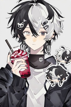 solo, , looking at viewer, , short hair, , simple background, , shirt, , black hair, , hair ornament, , 1boy, , white background, , holding, , hair between eyes, , jewelry, , closed mouth, , jacket, , upper body, , white hair, , grey hair, , male focus, , multicolored hair, , earrings, , hairclip, , hood, , two-tone hair, , cup, , black jacket, , grey eyes, , hoodie, , black nails, , holding cup, , drinking straw, , disposable cup, , , Negative prompt: ng_deepnegative_v1_75t,badhandv4,EasyNegative,worst quality,username,out of focus,bad proportions,watermark,cropped,signature,worstquality,grayscale,logo,text,blurry,low quality,bad anatomy,sketches,lowres,normal quality,monochrome,,nsfw, Steps: 29, Sampler: Euler a, CFG scale: 7.0, Seed: 3133268802, Size: 1024x1536, Model hash: e645ee1569, Model: Anime Model-Illustrious_v1.00.safetensors, Denoising strength: 0.0, RNG: CPU, Lora 1: 【ELK】Fire‘, Lora Hash 1: 4f3a21e23f, Lora Weight 1: 0.8, vae_name: automatic