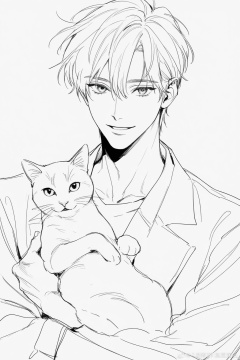 solo,looking at viewer,simple background,1boy,white background,upper body,male focus,sketch,greyscale,portrait,front view,short hair,parted lips,looking_at_viewer,holding_cat,smile,