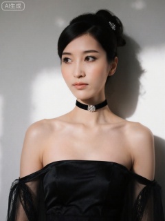 Shot by 12K Sony FX9, upper body composition (78% above chest to top of the head), Chinese beauty (warm yellow skin, delicate and flawless, smooth neck lines, delicate collarbone). Light makeup details: matte base makeup (oil-controlled without oil), light brown eyeshadow smudge, lip makeup is matte rose (soft edges), straight eyebrows with natural curves. The clothing is a black satin strapless bra (with wide edges designed to the upper edge of the chest, with invisible folds on the sides, highlighting the chest shape but not exposed), and a tulle shawl in the same color (only covering the shoulders, with fringed fringes on the edge). The hairstyle is high-plated (black hair is tight, the bun is smooth, and a silver plum hairpin is inserted on the side of the ears), and a black velvet choker (width 0.8cm, with a small rhinestone). The background is a pure white background board (beautéed under natural light), and the natural light is obliquely emitted by the window (light outlines the edge of the tube top, satin reflects soft light, and the skin is transparent and without shadow). The overall style is dignified and sexy, and the combination of satin and tulle shows implicit temptation.