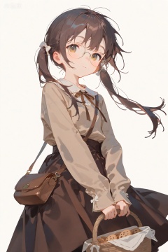 1girl,bag,basket,bow,brown bag,brown hair,brown ribbon,brown shirt,brown skirt,closed mouth,cookie,cowboy shot,food,glasses,hair bow,holding,holding basket,long hair,long sleeves,looking at viewer,neck ribbon,ribbon,round eyewear,shirt,shoulder bag,skirt,sleeves past wrists,solo,twintails,v arms,white bow,white background,