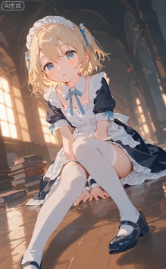 1girl,blonde hair,two side up,blue eyes,short hair,hair bow,blue bow,blush,book,cat,frills,hair ribbon,sitting,maid,mary janes,ribbon,shoes,solo,thighhighs,white thighhighs,wrist cuffs,looking at viewer,:o,indoors,