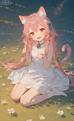 1girl, solo, long hair, animal ears, dress, tail, cat ears, bow, hair bow, smile, white dress, very long hair, cat tail, bell, cat girl, braid, :d, on grass, green bow, socks, sleeveless dress, flower, animal ear fluff, grass, looking at viewer, white socks, outdoors, sleeveless, neck bell, sitting, red eyes, paw pose, jingle bell, open mouth, white flower, hands up, twin braids, blush, no shoes, pink hair, fang,