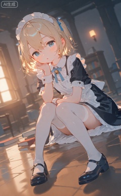 1girl,blonde hair,two side up,blue eyes,short hair,hair bow,blue bow,blush,book,cat,frills,hair ribbon,sitting,maid,mary janes,ribbon,shoes,solo,thighhighs,white thighhighs,wrist cuffs,looking at viewer,:o,indoors,
