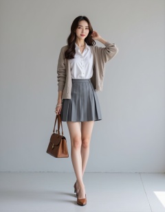 in Pleated mini skirt,Button-down Oxford shirt,Cardigan sweater tied around shoulders,Ballet flats,Holding Satchel bag,Pearl necklace. a real picture of a south korea woman,