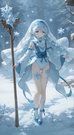 DD style, OC renderer, trendy toy style, porcelain, porcelain figures (the huge cedar is covered with thick white snow. Gushe Fairy stood under the cedar, with a silhouette, tears marks, holding a cedar pole, wearing a veil woven with snowflakes, white pupils, cedar crown, mysterious white tattoo on her body, matte fabric flows pearlescent in the cold dimming. Fusion of the texture of Western oil painting) Raw rice paper face rouge smudge, whole body